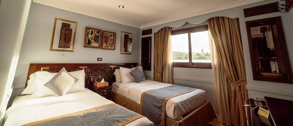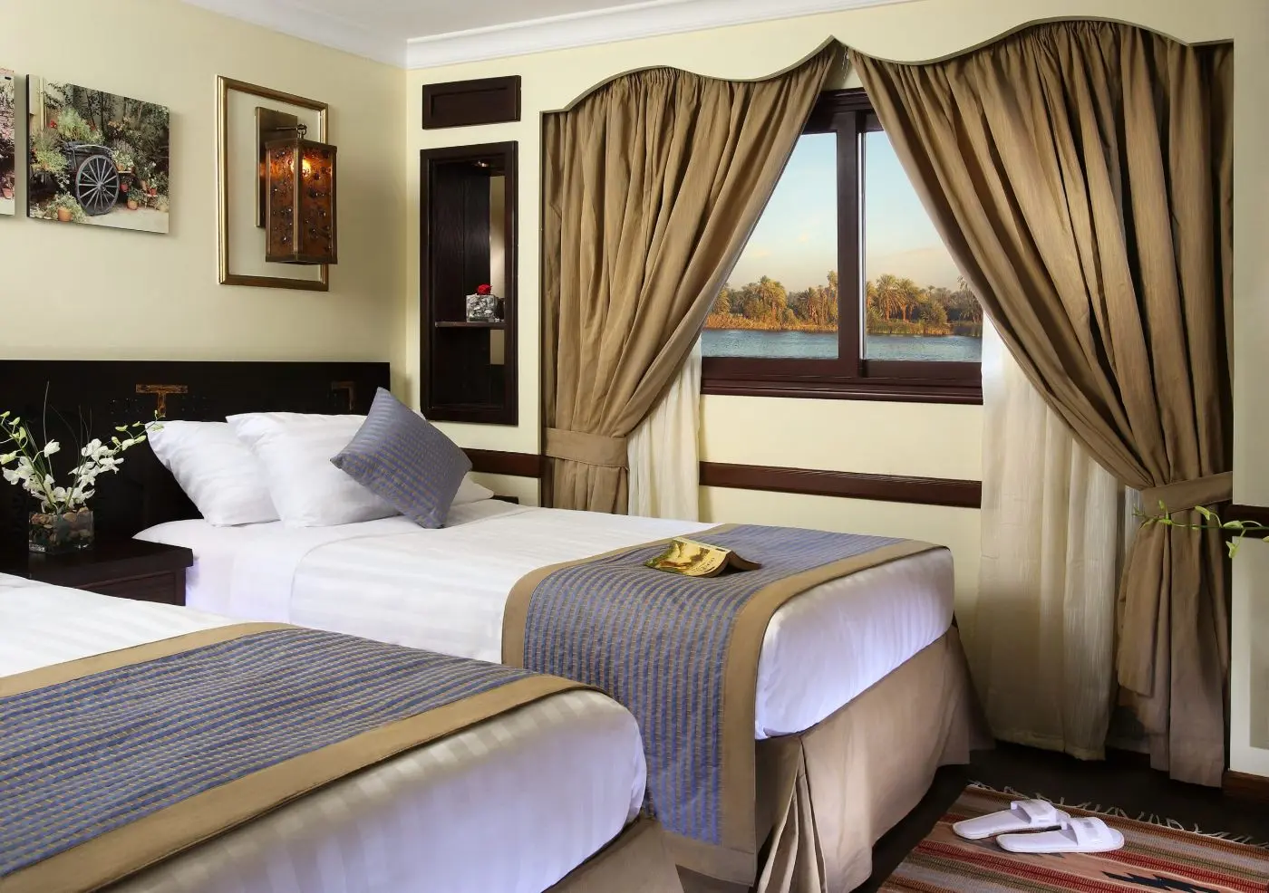 The rooms at Sonesta Amirat Dahabiya have been meticulously designed to give comfort and elegance. Whether you prefer twin beds or a more vast setting, the panoramic windows ensure you don't miss a moment of the stunning Nile vista. Furthermore, the residence has a large bed and its own terrace, making it a unique place to rest while admiring the surroundings.